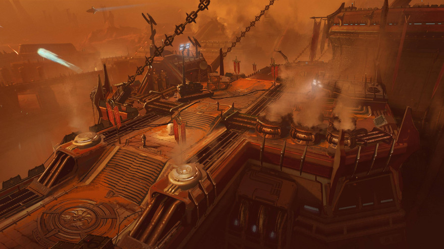 Hebeth Rooftops — это не просто площадка для сражений, а целый центр боевых действий, пропитанный духом инфернального гнета и индустриальной мизантропии. Скриншоты, опубликованные разработчиками, показывают обширную платформу, соответствующую концепции дизельпанка, с громоздкими конструкциями, отравленными парами, массивными котлами и демоническими символами, вырезанными на полу. Дизайнеры явно сделали ставку на создание мрачной и угнетающей атмосферы, которая отлично сочетается с акцентом на варварство и технологический прогресс.
